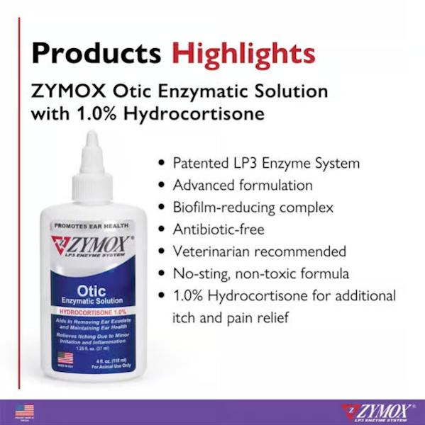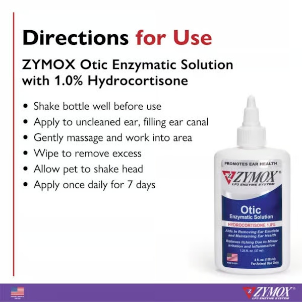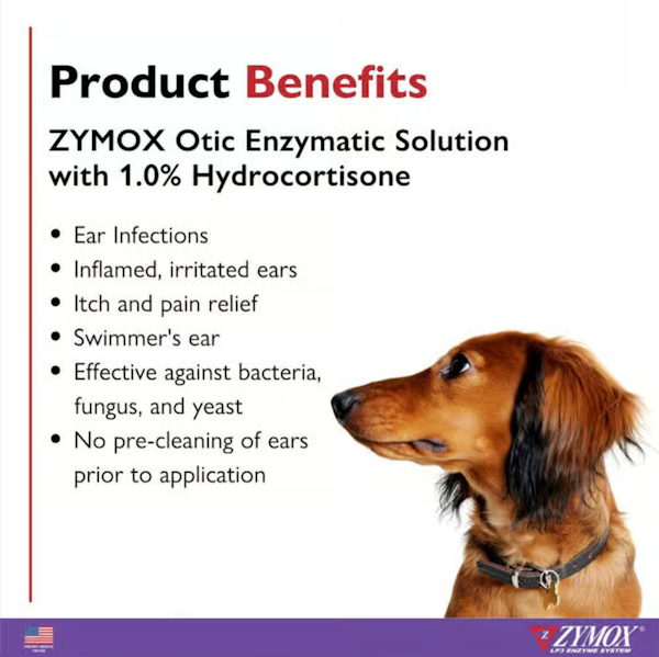 Zymox Otic Enzymatic Solution with Hydrocortisone is an enzymatic treatment for otitis externa (outer ear infection) in cats and dogs. It treats the ear externally for acute and chronic inflammation caused by bacterial, fungal, and yeast infections. This effective enzymatic system supports the natural defense mechanism of your pet's body to kill harmful bacteria, fungi, and yeast. Some factors that may contribute to possible ear infections include: excessive hair, a suppressed immune system, and excessive skin folds in the ear. The addition of hydrocortisone provides added relief from inflammation as well as relief from itching. Zymox Otic Enzymatic Solution with Hydrocortisone is a once-a-day treatment that requires no pre-cleaning and is non-invasive for easy use. It may be used to treat both acute and chronic ear infections and is safe for extended use on persistent cases of otitis externa.