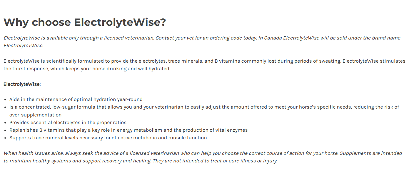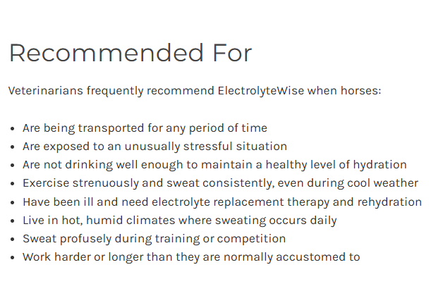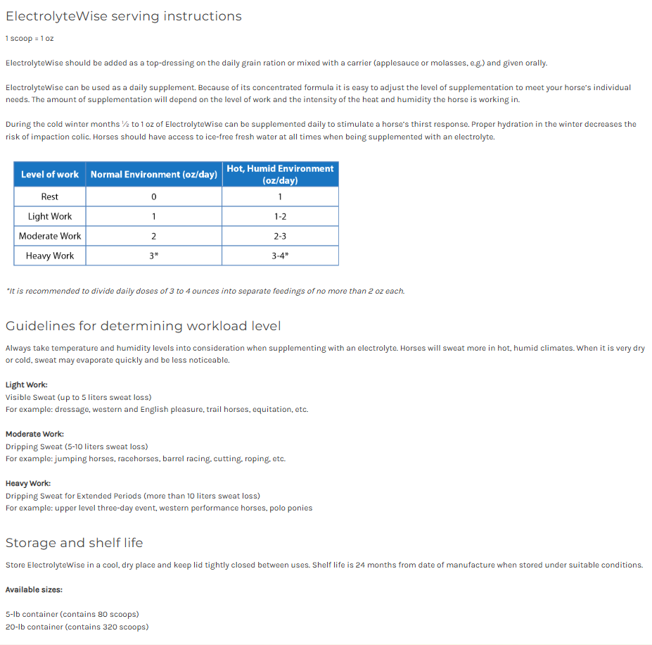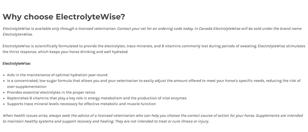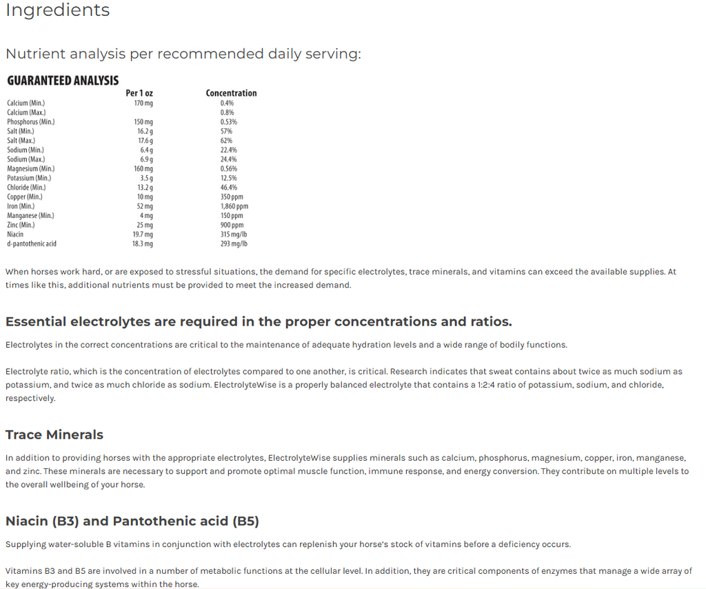 ElectrolyteWise Veterinary Formula by Wiser Concepts is an oral supplement designed to replenish electrolytes, trace minerals, and B vitamins commonly lost through sweat in horses. This scientifically formulated product stimulates the thirst response, encouraging horses to maintain adequate hydration.