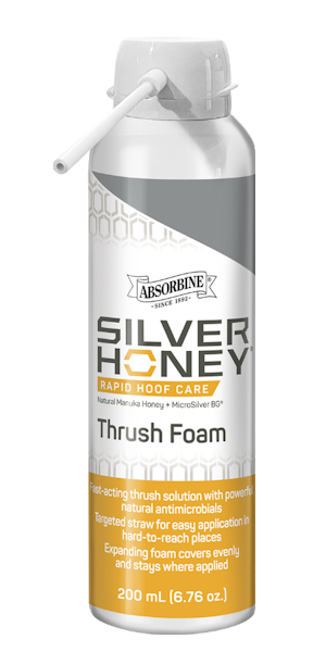 Half the battle is finding a product that's easy to apply, that doesn't stain or make a mess and can reach deep crevices of the hoof where infection lives. Silver Honey Thrush Foam expands to deliver even coverage and the straw applicator makes applying into deep crevices or under pads, fast and easy. The potent combination of Micro Silver BG and Manuka Honey delivers powerful antimicrobial benefit that's gentle on hoof tissues.