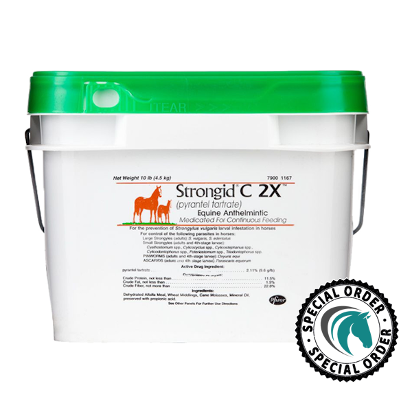 Strongid C2X helps prevent parasite build-up on a daily basis which may lead to better nutrition, health, appearance and performance. Intended as daily preventive treatment ideally complemented by twice-yearly purge deworming. Suppresses buildup of parasite burden during intervals between periodic deworming, while allowing low levels of infection that maintains natural host immunity Reduces pasture buildup of parasite eggs, limiting exposure to parasite larvae. Particularly useful where stocking density is high, pasture rotation is impossible, or exposure is continuous.