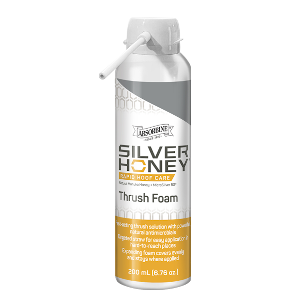 Half the battle is finding a product that's easy to apply, that doesn't stain or make a mess and can reach deep crevices of the hoof where infection lives. Silver Honey Thrush Foam expands to deliver even coverage and the straw applicator makes applying into deep crevices or under pads, fast and easy. The potent combination of Micro Silver BG and Manuka Honey delivers powerful antimicrobial benefit that's gentle on hoof tissues.